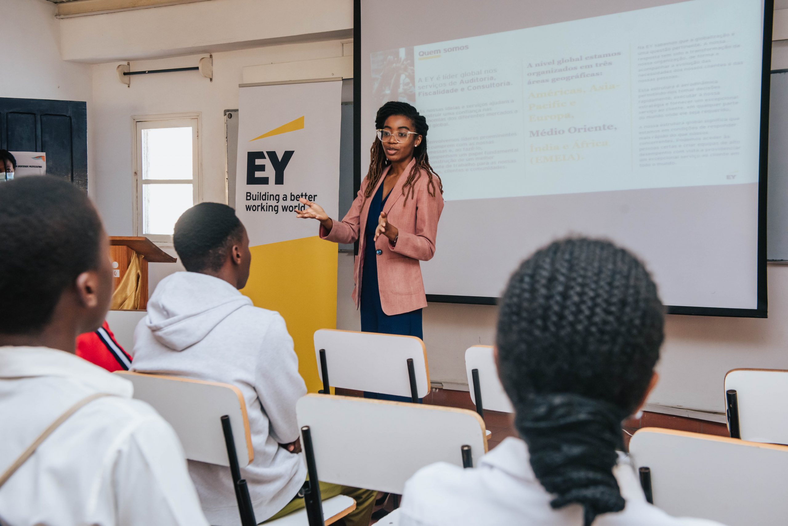 Com dezenas de estudantes do ensino médio e técnico profissional a assistir, Glayds Gande apresentou a EY, uma das maiores empresas de prestação de serviços a nível mundial. Aquela responsável reiterou a importância das organizações respeitarem a igualdade de género, destacando a importância da mulher no mundo dos negócios e salientando o papel das novas gerações.